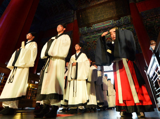 2015年9月28日,中國(guó)北京,在具有700多年歷史的國(guó)子監(jiān)孔廟,舉行祭孔大典,標(biāo)志著為期20天的第五屆孔廟國(guó)子監(jiān)文化節(jié)閉幕。為紀(jì)念“至圣先師”孔子誕辰2566周年,兩百余名來(lái)自廣渠門(mén)中學(xué)的學(xué)生在孔廟中院高聲誦讀《大同禮運(yùn)篇》……祭孔大典和拜師儀式一起成為歷屆國(guó)學(xué)文化街的國(guó)學(xué)經(jīng)典活動(dòng)。