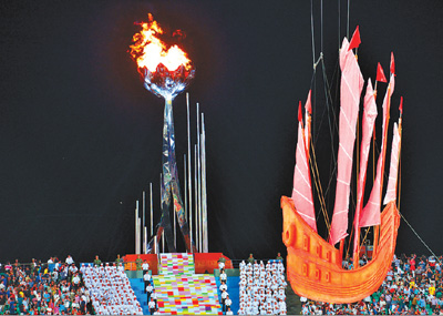 10月18日,第一屆全國(guó)青年運(yùn)動(dòng)會(huì)開幕式在福州海峽奧體中心主體育場(chǎng)舉行。圖為主火炬在開幕式現(xiàn)場(chǎng)熊熊燃燒。新華社記者 周 華攝