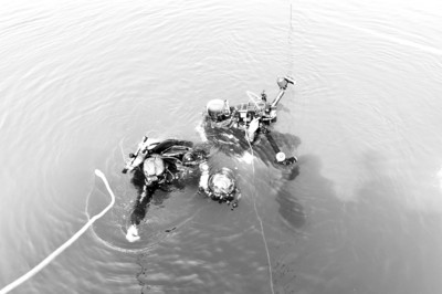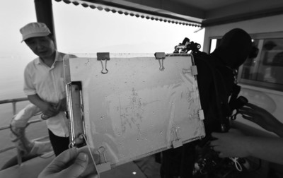昨天,太平湖上晴空萬里。記者隨著考古專家團(tuán)隊(duì)乘船剛剛靠近位于太平湖上的水下考古船,就被水面上泛起的陣陣水花吸引。考古人員介紹,這是考古人員在水下作業(yè)形成的水花。一邊是水下辛苦作業(yè),一邊是船上專家通過視頻影像實(shí)地指揮。經(jīng)過大約一個(gè)多小時(shí)的水下作業(yè),指揮人員給水下考古人員下達(dá)出水號令。約十多分鐘,幾名全副武裝的潛水人員逐漸浮出水面。