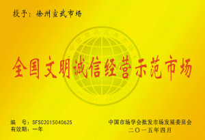 宣武市場(chǎng)成立30年來,在政府的大力支持下,不斷發(fā)展壯大,輻射淮海經(jīng)濟(jì)區(qū)1.2億人口,成為淮海經(jīng)濟(jì)區(qū)有較大影響力的市場(chǎng)之一。為了讓市民能夠放心采購,宣武市場(chǎng)的領(lǐng)導(dǎo)層狠抓市場(chǎng)誠信建設(shè),經(jīng)過多年努力,宣武市場(chǎng)不僅成為遠(yuǎn)近聞名的誠信基地,還是放心消費(fèi)示范區(qū)。
