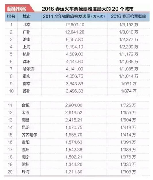 《2016年春運火車票搶票難度最大的20個城市》出自于“標準排名”,“標準排名”是一家基于互聯(lián)網(wǎng)大數(shù)據(jù)分析的信息服務商。上榜的20個城市是“標準排名”根據(jù)客流量,從而算出搶票概率產(chǎn)生的。