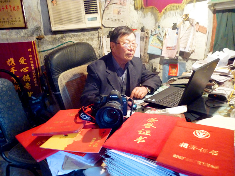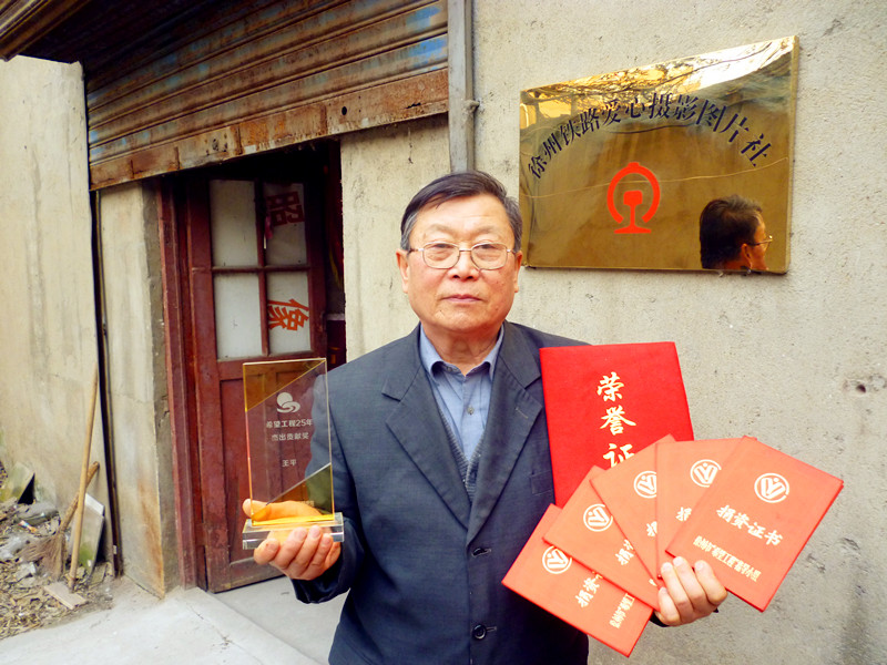 昨天(10日),記者來(lái)到位于原徐州鐵路客運(yùn)段北院的廢棄的鍋爐房,這里就是王平所在的徐州鐵路愛(ài)心圖片社工作室,12平方米大的舊房子內(nèi)還有一臺(tái)直徑1.7米的舊鍋爐占據(jù)著房屋的中央,四周墻壁上掛滿(mǎn)了王平榮獲的錦旗,他獲得的40多本榮譽(yù)證書(shū)裝滿(mǎn)了兩個(gè)手提袋,桌子上放著他19日從北京領(lǐng)回來(lái)的一個(gè)由中國(guó)青少年發(fā)展基金會(huì)頒發(fā)的“希望工程25周年杰出貢獻(xiàn)獎(jiǎng)”獎(jiǎng)杯。全國(guó)37名先進(jìn)個(gè)人中,王平是全國(guó)鐵路系統(tǒng)和我市惟一獲獎(jiǎng)?wù),獲獎(jiǎng)?wù)呙麊沃羞包括球星姚明和演員濮存昕。