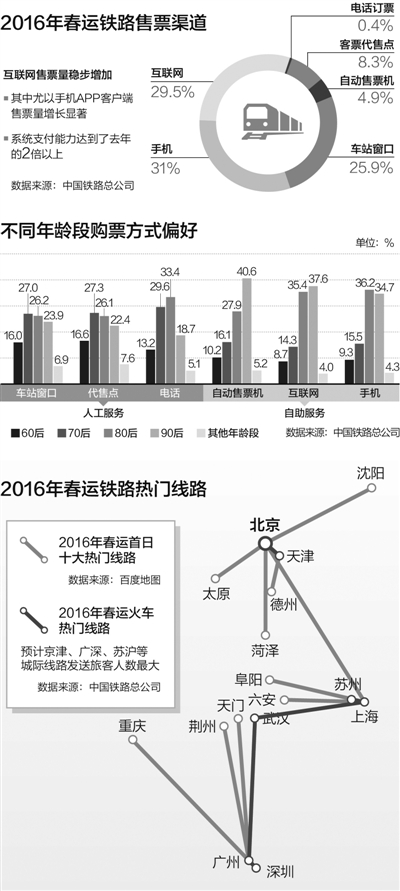 臨時售票窗口的終結,正是互聯(lián)網(wǎng)對鐵路春運帶來巨大變化的縮影。來自中國鐵路總公司的售票大數(shù)據(jù)顯示,對比最近幾年銷售渠道,自售機、代售、電話訂購渠道發(fā)售占比基本穩(wěn)定,而窗口與互聯(lián)網(wǎng)售票卻是此消彼長。2015年春運,鐵路車站窗口售票占總票額的29%,線上(互聯(lián)網(wǎng)+手機)售票占比為54.6%;今年春運,車站窗口售票占比進一步降至25.9%,而線上售票則提高到60.5%。