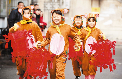 2月7日,除夕,在安徽省合肥市瑤海區(qū)明光路街道填海巷社區(qū),孩子們穿上卡通猴服飾為社區(qū)老黨員和空巢老人送“福”字燈籠;顒又,身穿卡通猴服飾的“猴娃”們將一盞盞紅紅的“福”字燈籠送到社區(qū)老黨員和空巢老人的手中,為他們送去溫暖,表達猴年新春的祝福。