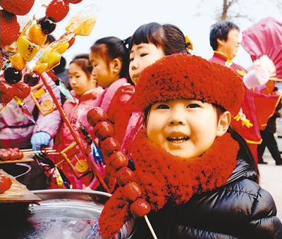 2月9日,北京大興區(qū)龐各莊鎮(zhèn)梨花村年貨大集上吃糖葫蘆的小朋友。