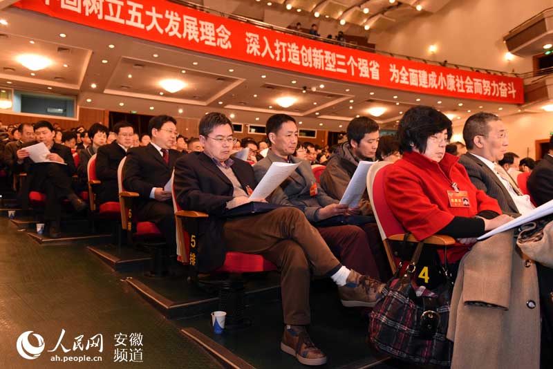今天的安徽大劇院內(nèi),一派莊嚴肅穆。巨大的國徽懸掛在主席臺帷幕中央,熠熠生輝;會場中“牢固樹立五大發(fā)展理念,深入打造創(chuàng)新型三個強省,為全面建成小康社會而努力奮斗”的大幅標語,鼓舞人心、催人奮進。