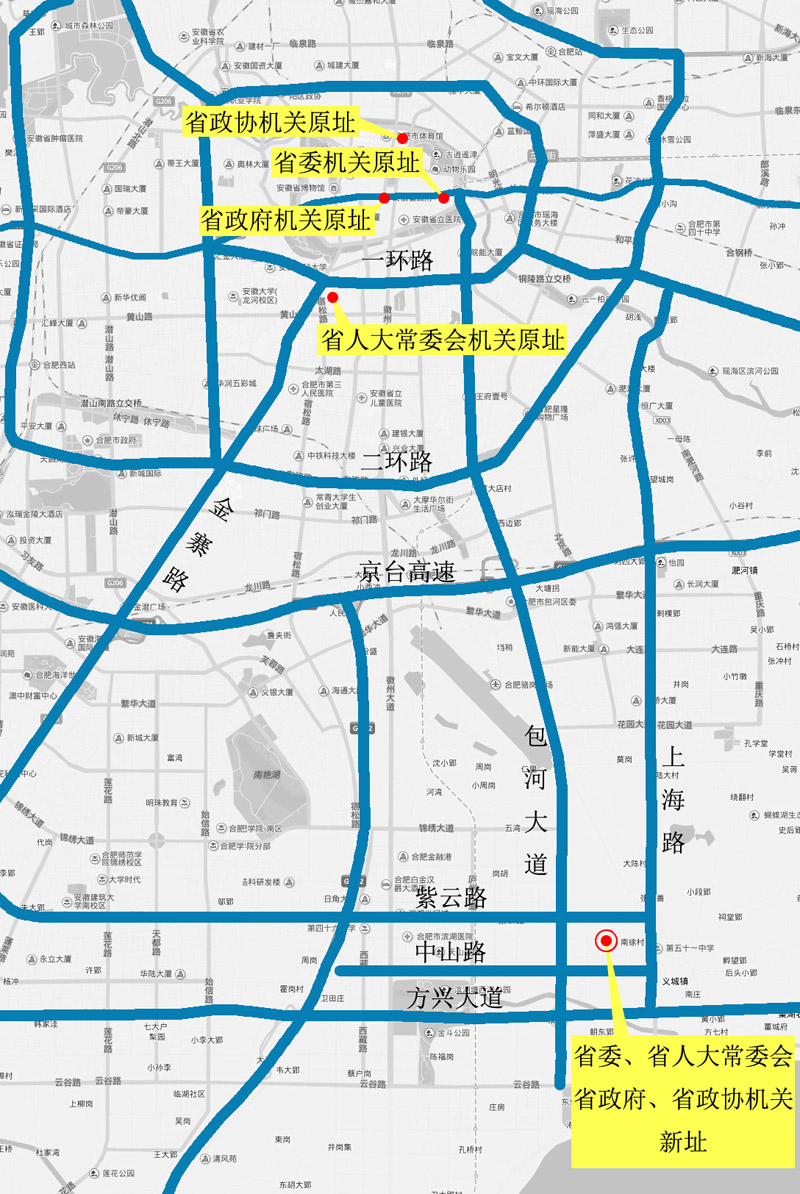 公告稱:經(jīng)國務(wù)院批準(zhǔn),中共安徽省委機(jī)關(guān)(合肥市長江中路39號)、省人大常委會機(jī)關(guān)(合肥市屯溪路435號)、省人民政府機(jī)關(guān)(合肥市長江中路221號)、省政協(xié)機(jī)關(guān)(合肥市宿州路317號)自2016年4月1日起開始搬遷,2016年5月1日起在合肥市包河區(qū)中山路1號正式辦公(郵編:230091)。遷址后原辦公電話不變。