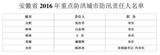 4月27日,安徽省防汛抗旱指揮部發(fā)出《關(guān)于2016年省領(lǐng)導(dǎo)防汛抗旱責(zé)任分工的通知》,要求在防汛抗旱期間實行省領(lǐng)導(dǎo)牽頭負(fù)責(zé)、有關(guān)部門負(fù)責(zé)同志配合的分工負(fù)責(zé)制,負(fù)責(zé)長江、淮河干流及有關(guān)主要支流的防汛工作,分片指導(dǎo)督查各市的防汛抗旱工作。