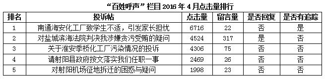 截止5月10日,其中《南通海安化工廠致學(xué)生不適,引發(fā)家長(zhǎng)擔(dān)憂》點(diǎn)擊量最高。點(diǎn)擊量排名前五位的投訴中,三條來自鹽城市,其中又有兩條來自射陽(yáng)縣: