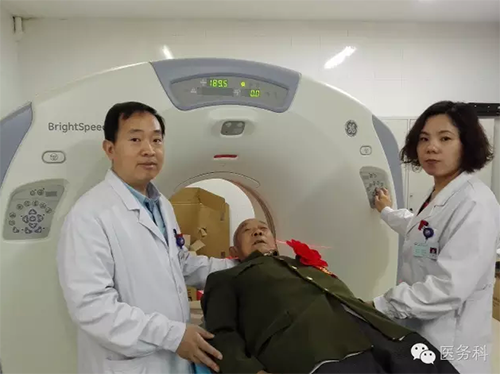 我院放射科、CT室副主任醫(yī)師董祥保和主管技師時(shí)喜姑正在認(rèn)真為功臣們進(jìn)行CT檢查!