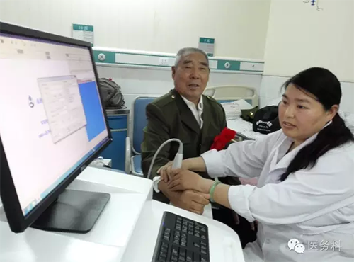 醫(yī)師李楠楠正在對(duì)革命功臣查體,為每一位功臣建立健康檔案!