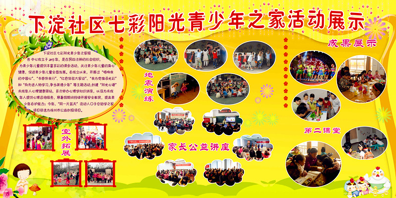 為了解決這一難題,維護(hù)社會(huì)穩(wěn)定,下淀社區(qū)黨委通過(guò)積極申報(bào)和在民政注冊(cè),2013成立了“七彩陽(yáng)光青少年之家”,旨在為青少年兒童提供豐富多彩的課余活動(dòng),關(guān)注青少年兒童的身心健康,促進(jìn)青少年兒童全面發(fā)展。“七彩陽(yáng)光青少年之家”自成立以來(lái),先后開(kāi)展過(guò)“唱響我的中國(guó)心”、“書(shū)香伴我行”、“紅色體驗(yàn)大家談”、“我為黨旗添光彩”和“向先進(jìn)人物學(xué)習(xí),爭(zhēng)當(dāng)美德少年”等主題活動(dòng)。另外,社區(qū)還創(chuàng)建了“陽(yáng)光心港”未成年人心理健康驛站,多次舉辦心理學(xué)知識(shí)講座,以及為未成年人提供心理咨詢服務(wù),寒暑假期間持續(xù)開(kāi)展安全教育,提高青少年自護(hù)能力。