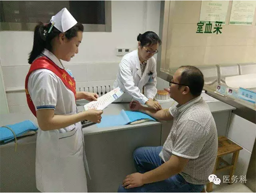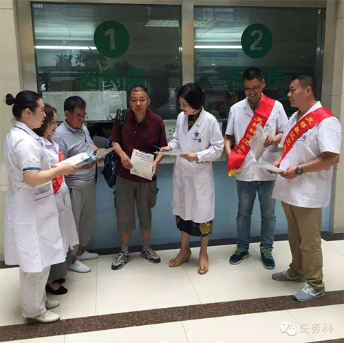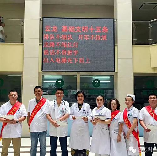 在職黨支部書記、副院長沈青在認(rèn)真給就診者免費(fèi)發(fā)放《云龍基礎(chǔ)文明15條》
