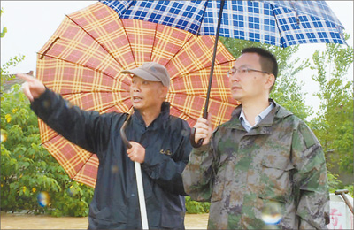 7月1日,安徽含山縣環(huán)峰鎮(zhèn)三龍村黨總支書記尹建平(左)在察看汛情。 |