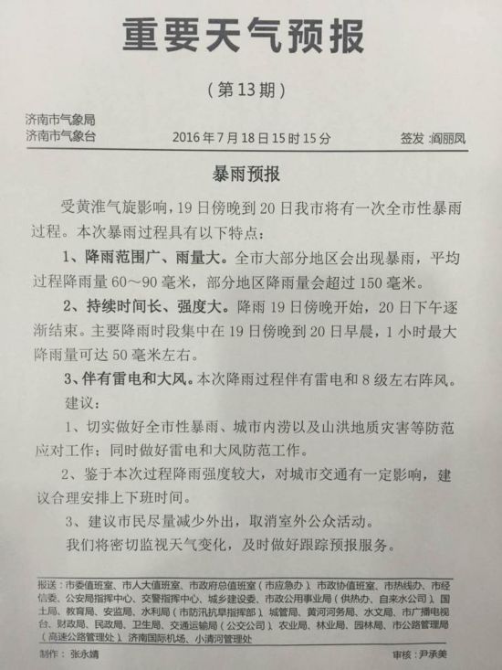 據(jù)省、市氣象部門(mén)預(yù)報(bào),7月19日傍晚到20日濟(jì)南市將有一次全市性暴雨過(guò)程,平均過(guò)程降雨量60~90毫米,部分地區(qū)降雨量會(huì)超過(guò)150毫米。