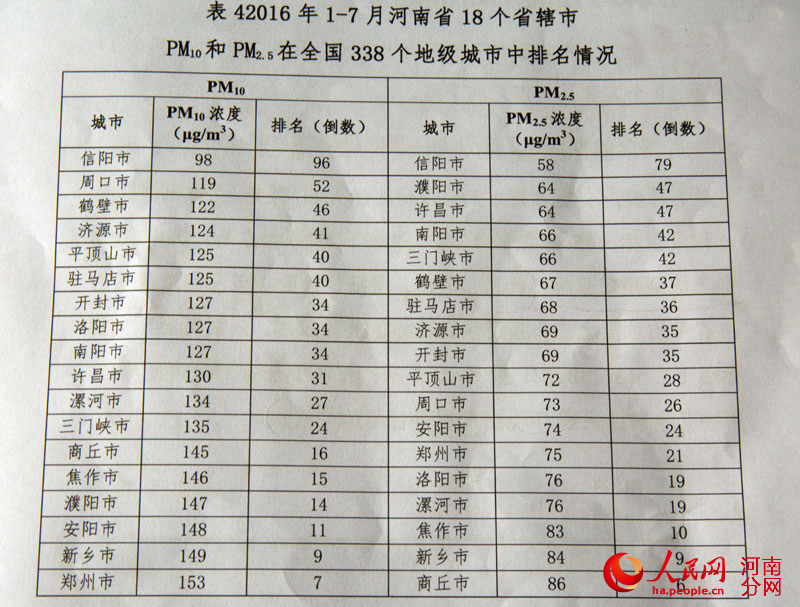 1-7月,河南18省轄市優(yōu)良天數(shù)為109天,低于年度目標(biāo)值(195天)86天。PM10濃度超年度目標(biāo)17微克/立方米。同時(shí),在全國(guó)338個(gè)地級(jí)市的PM10及PM2.5的排名中,河南18省轄市均在倒數(shù)100名之列。