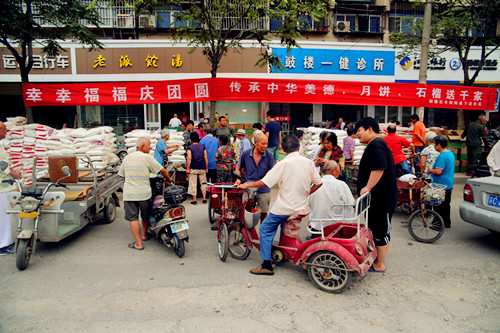 中國(guó)黃淮網(wǎng)江蘇徐州9月13日訊(老藤 亞?wèn)|)今天上午,在徐州市下淀路北側(cè),人潮涌動(dòng),笑聲連連。不少行人駐足相問(wèn):路邊擺這么多的面粉、油、月餅、石榴等十幾個(gè)品種,是展銷(xiāo)會(huì)嗎?不一會(huì)兒,樹(shù)上掛起了“幸幸福福慶團(tuán)圓”和“傳承中華美德,月餅、石榴送千家”的橫幅,落款為“鼓樓區(qū)豐財(cái)街道下淀社區(qū)”。即刻,大家相視一笑,流露出羨慕的眼光,“明白了,這是社區(qū)在為居民發(fā)放中秋節(jié)禮品呢。”