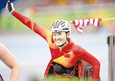 當(dāng)?shù)貢r(shí)間九月十七日,在里約殘奧會(huì)輪椅競(jìng)速女子八百米T53級(jí)決賽中,周洪轉(zhuǎn)以一分四十七秒四五的成績(jī)獲得冠軍并打破世界紀(jì)錄,為中國(guó)殘奧體育代表團(tuán)摘得在里約殘奧會(huì)上的第一百枚金牌。圖為中國(guó)隊(duì)選手周洪轉(zhuǎn)賽后向觀眾致意。 |