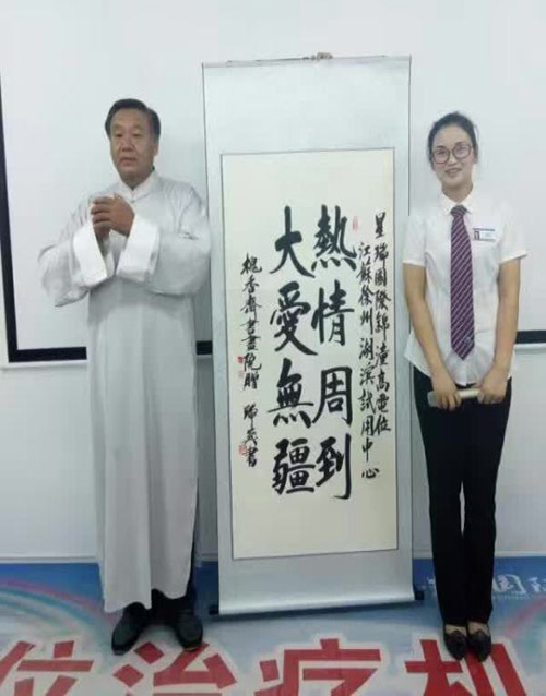 (本網(wǎng)訊 滕富強(qiáng))2016年10月10日早晨,徐州槐香齋書(shū)畫(huà)院院長(zhǎng)張友臣先生,把一幅四尺中堂的書(shū)法作品贈(zèng)送給星瑞國(guó)際錦潼高電位徐州湖濱體驗(yàn)中心,對(duì)他們?yōu)樾熘菔兄欣夏耆嗣赓M(fèi)做治療體驗(yàn),解除病痛,過(guò)上更健康充實(shí)生活的做法表示感謝,同時(shí)也弘揚(yáng)了中華民族書(shū)法藝術(shù)的真諦。