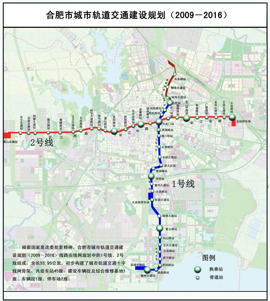 其中1號線一、二期工程北起合肥站,南至徽州大道站,線路全長24.5km,設(shè)23座車站,分別是:合肥火車站、長淮站、明光路站、大東門站、包公園站、合工大南區(qū)站、朱崗站、秋浦河路站、葛大店站、望湖城站、合肥南站、南站南廣場站、駱崗站、高王站、濱湖會展中心站、紫廬站、塘西河公園站、金斗公園站、云谷路站、萬達(dá)城站、萬年埠站、丙子鋪站和九聯(lián)圩站。