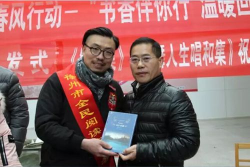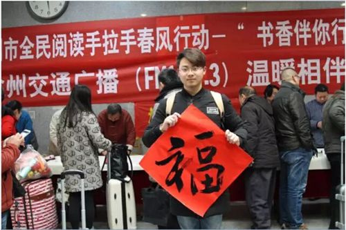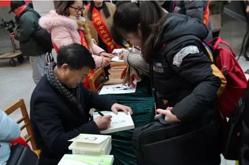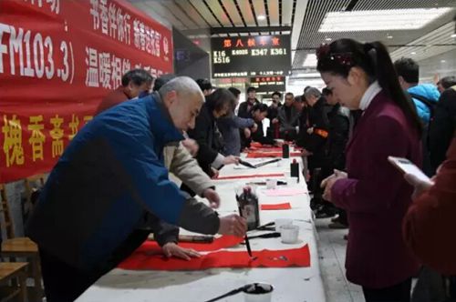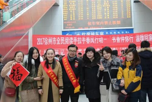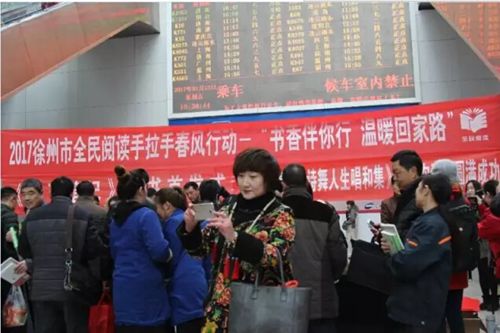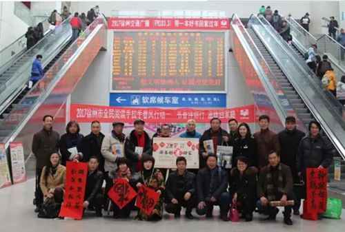 原來,這是由徐州市全民閱讀辦、徐州市文廣新局主辦;市文化藝術(shù)交流協(xié)會、市交通廣播、上海鐵路局徐州站承辦;徐州博庫書城和中國作家·雨花讀者俱樂部協(xié)辦的“書香伴你行 新春送祝福”活動。這次活動是由“江蘇百城惠”冠名的,中國黃淮網(wǎng)提供媒體支持;顒為廣大返鄉(xiāng)旅客送上一份精心準(zhǔn)備的“精神年貨”。徐州交通廣播電臺著名播音主持人阿原、木菡化身書童,將一本本新書送給回家過年的旅客。市文化藝術(shù)交流協(xié)會組織了徐州著名作家杜長明《月下筆記》新書發(fā)布會,這位原黃山新村院長在退休后,一本本新書相機(jī)面世,今天值春運第一天,就從自己家里帶來了400多本新書,簽名送給了南來北往從徐州火車站出發(fā)的旅客。同時參與贈書活動的還有李敏、孔伯祥的《敏行集》和《詩舞人生唱和集》,徐州著名作家,交流協(xié)會李凌秘書長帶來的江蘇省《雨花》雜志,與此同時,文化藝術(shù)交流協(xié)會還組織了十幾位書法家會員揮毫潑墨,為大家送上一幅幅春聯(lián)和一張張福字,一時間擠爆了現(xiàn)場,南來北往的客人帶著從徐州作家、書畫家送去的文化墨寶踏上了旅途,將文化的溫暖傳送到祖國各地。