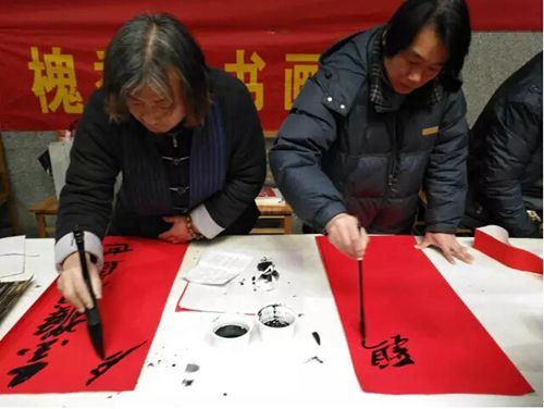 書法家們?yōu)檐囌竟ぷ魅藛T贈送春聯(lián)。