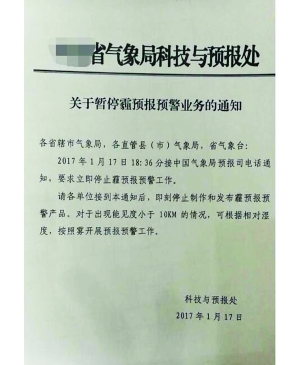 網(wǎng)上流傳的消息來源于一張圖片。圖片上寫著:“各省轄市氣象局,各直管縣(市)氣象局,省氣象臺:2017年1月17日18:36分接中國氣象局預報司電話通知,要求立即停止霾預報預警工作。請各單位接到本通知后,即刻停止制作和發(fā)布霾預報預警產(chǎn)品……”此外流傳的另一張圖片上也寫著:“接中國氣象局通知,自2017年1月18日始暫停霾實況、預報、預警等業(yè)務服務工作。”