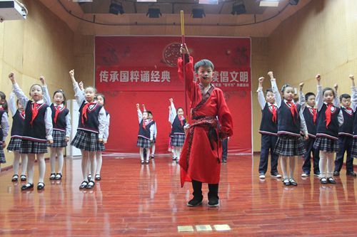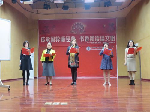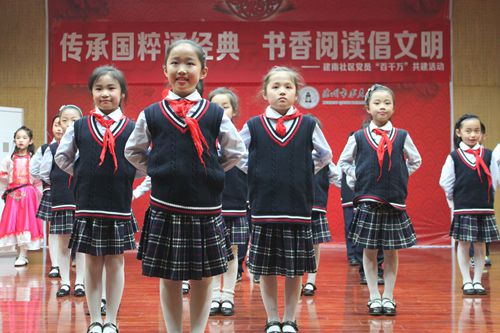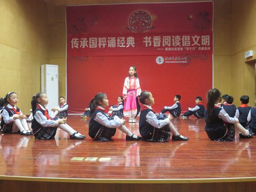 誦讀活動一開始,具有國學經(jīng)典誦讀特色的徐州市求是小學的學生們頌讀了《 滿江紅》、《 水調(diào)歌頭》、《木蘭從軍》。建南社區(qū)老黨員服務隊的老黨員朗誦了《 我是共產(chǎn)黨員》。泉山區(qū)教體局的配樂詩朗誦《面朝大海 春暖花開》、《 相信未來》。建南社區(qū)黨委書記董長惠的配樂詩朗誦《 我愛社區(qū)》。
