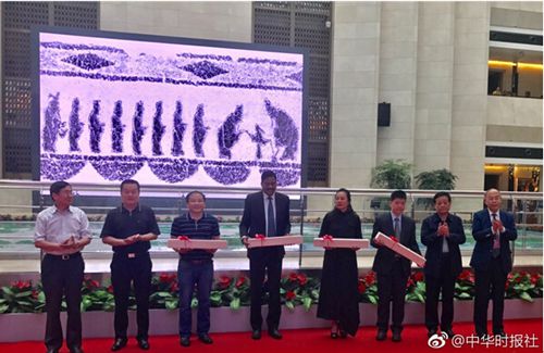 徐州籍深圳大學(xué)教授馬波生、中華時(shí)報(bào)傳媒集團(tuán)主席曾曉輝、印度駐廣州總領(lǐng)事館文化參贊在馬教授作品前留影。