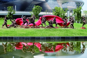 《戲韻》一組11件,立在江蘇大劇院北門的草坪上。這組作品取材于“三娘教子”“三擊掌”和“趙氏孤兒”等傳統(tǒng)經(jīng)典劇目,這些雕塑表情傳神,一招一式讓人感受到戲劇的魅力。“它們就是永不落幕的戲曲。”吳為山說。(胡玉梅 鹿偉)