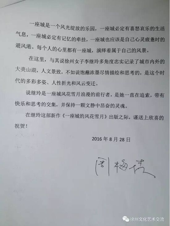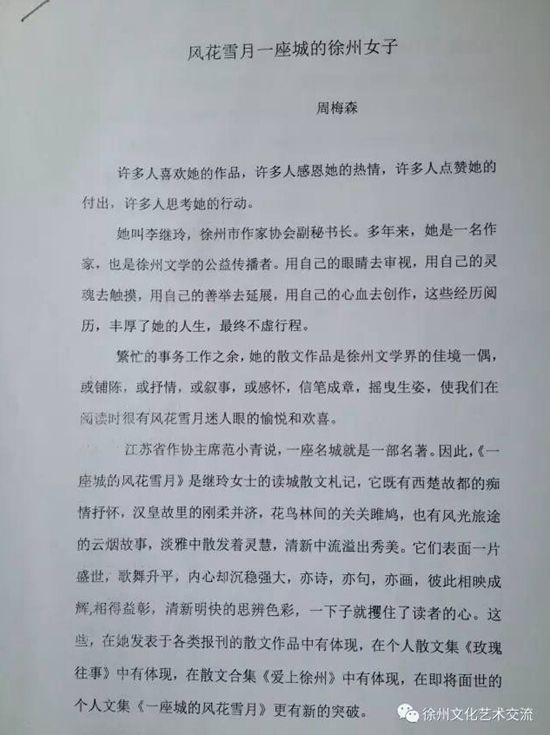著名作家周梅森在為李繼玲的第二本個人文集《一座城的風(fēng)花雪月》序中寫道:“本書是繼玲女士的讀城散文札記,它既有西楚故都的癡情抒懷,漢皇故里的剛?cè)岵?jì),花鳥林間的關(guān)關(guān)雎鳩,也有風(fēng)光旅途的云煙故事,……。這些,在她發(fā)表于各類報(bào)刊的散文作品中有體現(xiàn),在個人散文集《玫瑰往事》中有體現(xiàn),在散文合集《愛上徐州》中有體現(xiàn),在即將面世的個人文集《一座城的風(fēng)花雪月》更有新的突破。”在繼玲這部新作《一座城的風(fēng)花雪月》出版之際,謹(jǐn)送上欣喜的祝賀!