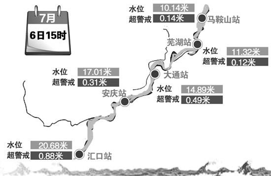 昨日15時(shí),匯口站、安慶站、大通站、蕪湖站、馬鞍山站均超警戒水位。