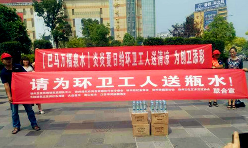 活動(dòng)一經(jīng)發(fā)出,立即得到“巴馬萬福泉水”“徐州經(jīng)紀(jì)業(yè)商會(huì)”“徐州收藏家協(xié)會(huì)”“徐州文化藝術(shù)交流協(xié)會(huì)”的大力支持,并得到了各會(huì)會(huì)員的大力支持。參與單位有:五糧液集團(tuán)亞洲紅石榴酒、大益普洱、江蘇洋河國御酒業(yè)。希望各位企業(yè)家都奉獻(xiàn)一份愛心,把每一份清涼的愛心送到每一名環(huán)衛(wèi)工人手中,向這些城市美容師們表達(dá)誠摯的關(guān)切和敬意。