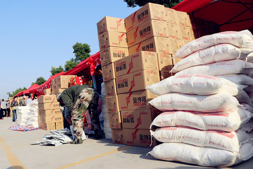社區(qū)所在地的停車場(chǎng)內(nèi),一字排開十幾個(gè)防雨棚,下面整齊地?cái)[放著各種生活必需品。物資也可謂豐富多樣,有大米、面粉、掛面、玉米油、月餅、松花蛋、咸青皮、石榴、燒雞,等十幾個(gè)品種,涉農(nóng)村民還同時(shí)領(lǐng)到過(guò)節(jié)現(xiàn)金200元。