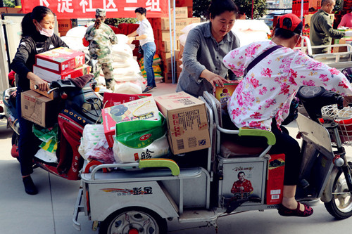 前來(lái)領(lǐng)取禮品的村民中,有開著轎車來(lái)的、有騎著電動(dòng)三輪車來(lái)的,還有蹬著小三輪來(lái)的。70多歲的社區(qū)居民齊大爺老兩口笑呵呵地騎著電動(dòng)三輪車來(lái)領(lǐng)物品?粗褲M禮品的三輪車,老兩口笑得合不攏嘴,老人說(shuō):“你看看這一車東西要啥有啥,社區(qū)什么都為我們想到了,這些物品別說(shuō)過(guò)節(jié)了,都?jí)蛭覀兝蟽煽诔陨虾脦讉(gè)月的。”62歲的涂師傅說(shuō),他的兩個(gè)孩子都在外地工作,每次過(guò)年他都會(huì)交待孩子們,千萬(wàn)不要再給他們買東西,社區(qū)每年都發(fā)物品,春節(jié)、中秋節(jié)都有,只要過(guò)來(lái)看看他們就心滿意足了。