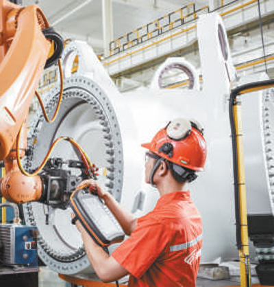 工人在新疆金風(fēng)科技股份有限公司哈密總裝智能生產(chǎn)線上進行數(shù)控操作。