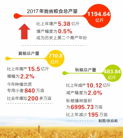 國家統(tǒng)計局河南調(diào)查總隊12月11日發(fā)布消息,根據(jù)該總隊調(diào)查,并經(jīng)國家統(tǒng)計局核定,2017年我省糧食總產(chǎn)量為1194.64億斤,比上年增產(chǎn)5.38億斤,增產(chǎn)幅度為0.5%,成為歷史上第二個高產(chǎn)年份。