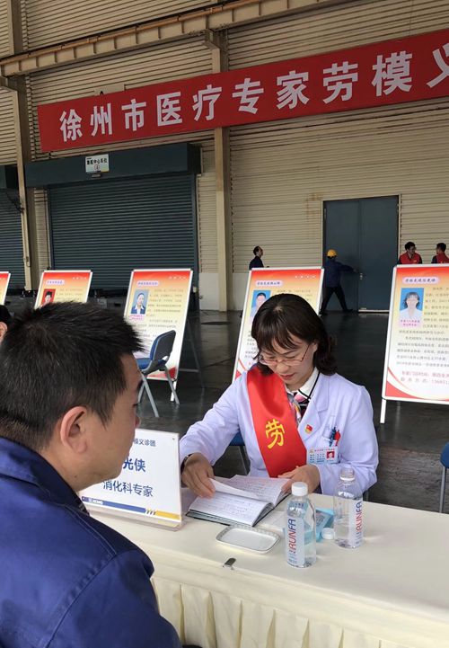 上面兩張圖為427日,陳光俠作為徐州市醫(yī)療專家勞模義診團成員走進“徐工”,為奮進在一線的普通勞動者進行義診