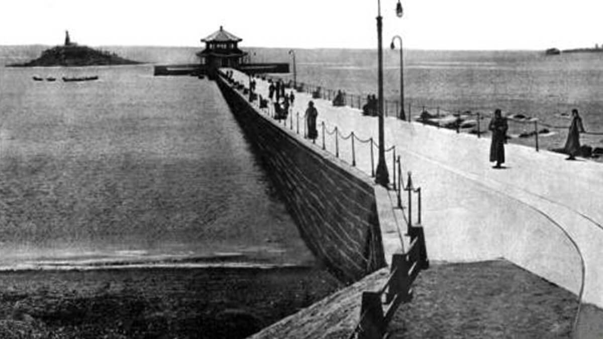 1931年9月,棧橋南端增建半園形防波堤,堤上新建一座中國民族傳統(tǒng)風(fēng)格的雙層飛檐八角亭閣,名“回瀾閣”。游人佇立閣旁,欣賞層層巨浪涌來,“飛閣回瀾”被譽(yù)為“青島十景”之一。
