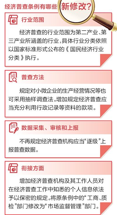 為適應(yīng)新形勢下經(jīng)濟(jì)普查工作的需要,確保普查數(shù)據(jù)真實準(zhǔn)確、完整及時,國務(wù)院決定修改2004年公布施行的《全國經(jīng)濟(jì)普查條例》(以下稱原條例)。賈楠介紹,隨著經(jīng)濟(jì)社會發(fā)展,原條例有關(guān)經(jīng)濟(jì)普查的行業(yè)范圍、普查方法、普查機構(gòu)工作職責(zé)和工作流程的一些規(guī)定,已不能完全適應(yīng)實際情況變化,有必要修改完善。此外,2009年修訂了《統(tǒng)計法》,2017年制定了《統(tǒng)計法實施條例》,原條例的個別條款也需要與《統(tǒng)計法》及其實施條例相銜接。