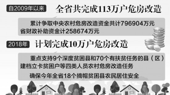 記者從省扶貧辦獲悉,我省自2009年起實(shí)施農(nóng)村危房改造以來,全省共完成113萬戶危房改造。 2018年計劃完成10萬戶危房改造,其中建檔立卡貧困戶6萬戶以上,重點(diǎn)支持9個深度貧困縣和70個有扶貧任務(wù)的縣(區(qū))建檔立卡貧困戶等四類人員農(nóng)村危房改造任務(wù),確保今年全省18個摘帽貧困縣農(nóng)民居住安全。