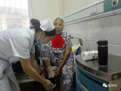 內(nèi)一科護師盧蓮蓮幫老戰(zhàn)士試穿新鞋