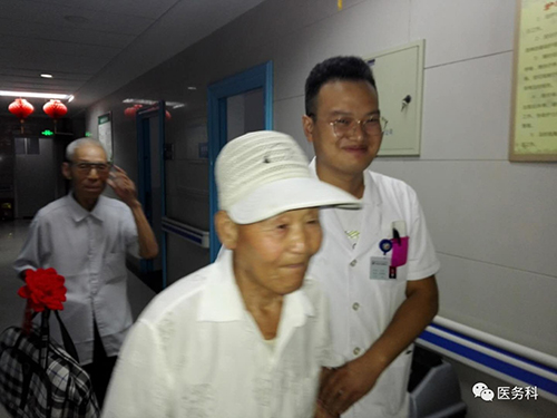 內(nèi)一科帥小伙王偉醫(yī)師攙扶老戰(zhàn)士入住療養(yǎng)區(qū)