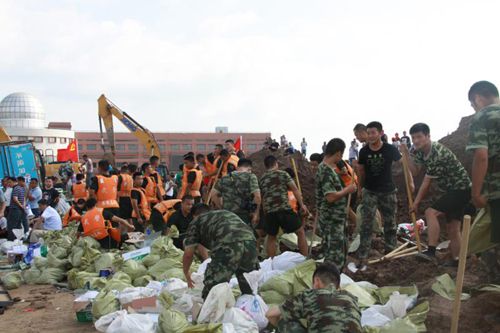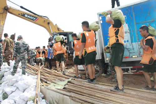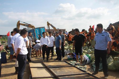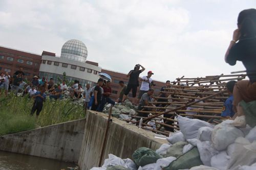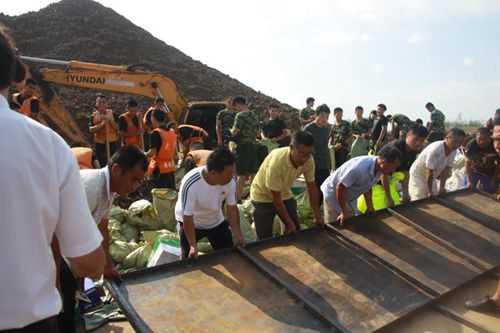 在濉溪縣委書記趙德志的親自指導(dǎo)下,現(xiàn)場搶險(xiǎn)緊張有序的進(jìn)行著。同時(shí),附近居民和乾隆湖工業(yè)園的人員進(jìn)行緊張有序撤離;幢笔形渚ш(duì)派40名武警官兵進(jìn)行救災(zāi),另外有警察、民兵、志愿者幾百人奮戰(zhàn)在救災(zāi)一線。用鋼管連接起來的兩個(gè)長九米寬四米多的圍欄,然后又投放近兩萬個(gè)沙袋,終于把洪水堵住,整個(gè)搶險(xiǎn)過程持續(xù)了五個(gè)小時(shí),除一位民兵救災(zāi)時(shí)沙袋碰傷頭部外,周邊居民沒有傷亡事故發(fā)生。