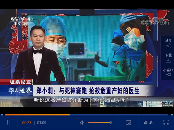 913日下午13:00,中央四套國際頻道《華人世界》欄目播出徐州市第一人民醫(yī)院援非隊(duì)員鄭小莉在援非期間搶救當(dāng)?shù)匚V禺a(chǎn)婦的事跡,宣傳片介紹了鄭醫(yī)生在非洲救助患者的動(dòng)人故事。