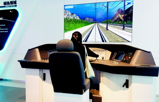 創(chuàng)新展示中心內(nèi),參觀者在體驗(yàn)列車智能化仿真駕駛系統(tǒng)。