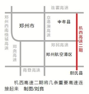機(jī)西高速二期建設(shè)里程45.102公里,起于中牟縣東北,接連霍高速,止于開封市尉氏縣,與2015年12月通車的機(jī)西高速一期工程相接,是鄭州航空港區(qū)的東環(huán)高速。該路段呈南北走向,從北向南依次與連霍高速、鄭民高速、商登高速、蘭南高速、永登高速、商周高速串聯(lián),把鄭州、開封、許昌、周口的幾條重要高速公路連了起來。