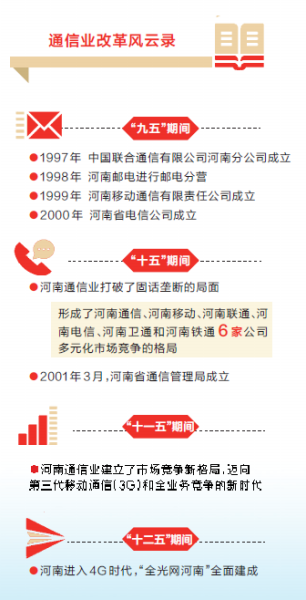 在波瀾壯闊的改革開放大潮中,中國通信行業(yè)經(jīng)歷了崛起、變革和奮進,書寫了一篇又一篇舉世矚目、光輝燦爛的華麗篇章。河南通信業(yè)在建立社會主義市場經(jīng)濟的進程中快速發(fā)展,走出了一條“在發(fā)展中改革,在改革中發(fā)展”的路子,成為全省國民經(jīng)濟基礎(chǔ)性、戰(zhàn)略性、先導(dǎo)性產(chǎn)業(yè)。