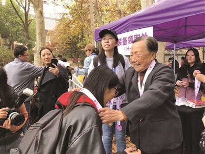到中午11點半,21個徒步方陣陸續(xù)抵達終點——南師大隨園校區(qū),南京大屠殺幸存者夏淑琴為徒步參與者頒發(fā)了和平獎?wù)。夏淑琴說:“看見這么多(參加和平徒步)的年輕人,很開心。”