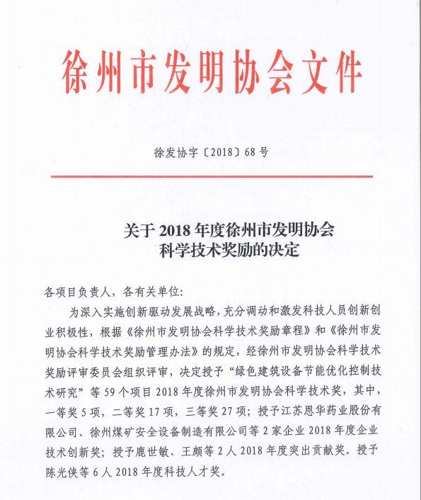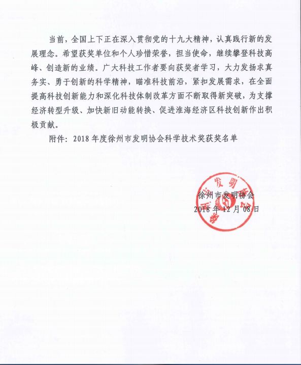 12 月 8 日下午 14:00,徐州市發(fā)明協(xié)會(huì)在徐州市全季酒店會(huì)議室召開2018年度科學(xué)技術(shù)獎(jiǎng)?lì)C獎(jiǎng)大會(huì)。